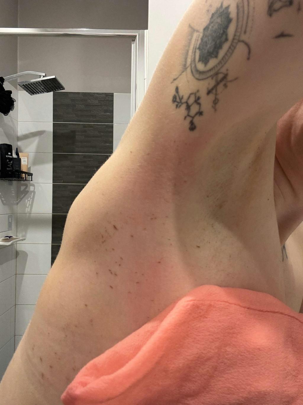 Move out of the water and exfoliate your skin vigorously using upward and downward strokes until you see dead skin cells roll away. Repeat for each desired area on your body. The more pressure you apply, the better the results. (Redness is normal)